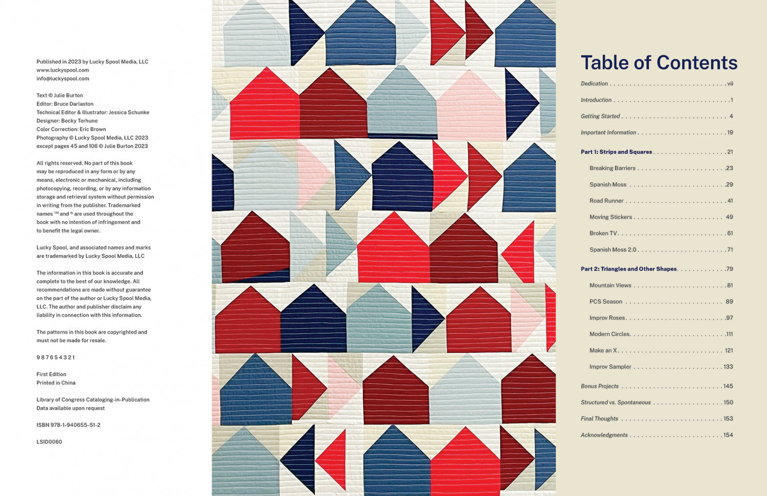 A boundary-breaking journey in and introductory to improv quilting While improv quilting involves starting a quilt without a pattern, it is a skill and a technique. In modern quilting, every quilter approaches improv with their own style and method, keeping the foundations of traditional quilting in mind. In My Improv Journey, Julie Burton, breaks the seams between traditional and improv in the quilting world. She takes the reader on her journey in a quilting education, showing classic quilt patterns with a modern twist and introducing improv to traditional quilters.
